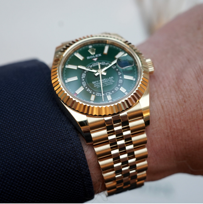 Was also macht diese Sky-Dweller so besonders für mich? Nun, zunächst einmal ist es die klassische Extravaganz von Gelbgold auf Grün. Dieser Look war in der Vergangenheit sehr beliebt, vor allem in den 1970er- und 1980er-Jahren, als nicht nur Rolex Replica, sondern viele andere Marken mit dem Kontrast beider Farben spielten. Ob mit lackierten Zifferblättern oder natürlich Zifferblättern aus Malachitstein – der Stil erfreute sich großer Beliebtheit. Aber wenn man bedenkt, dass es die Zeit der Wall-Street-Cowboys, der Gordon Gekkos und der Jordan Belforts war … passte es einfach ins Bild. Rückblickend könnte man sagen, es war vielleicht etwas dreist, und ich würde dem nicht widersprechen, aber Gelbgold erfreut sich in den letzten Jahren wieder großer Beliebtheit, und Uhren wie diese bestätigen einmal mehr, warum es so gut aussieht, wenn es richtig eingesetzt wird!