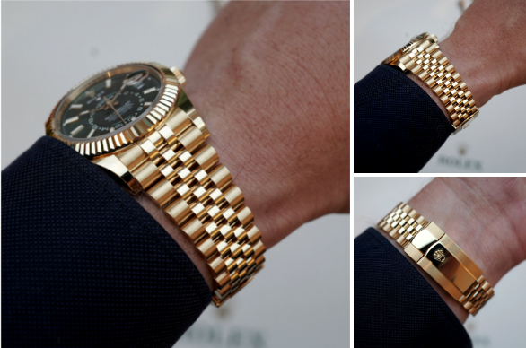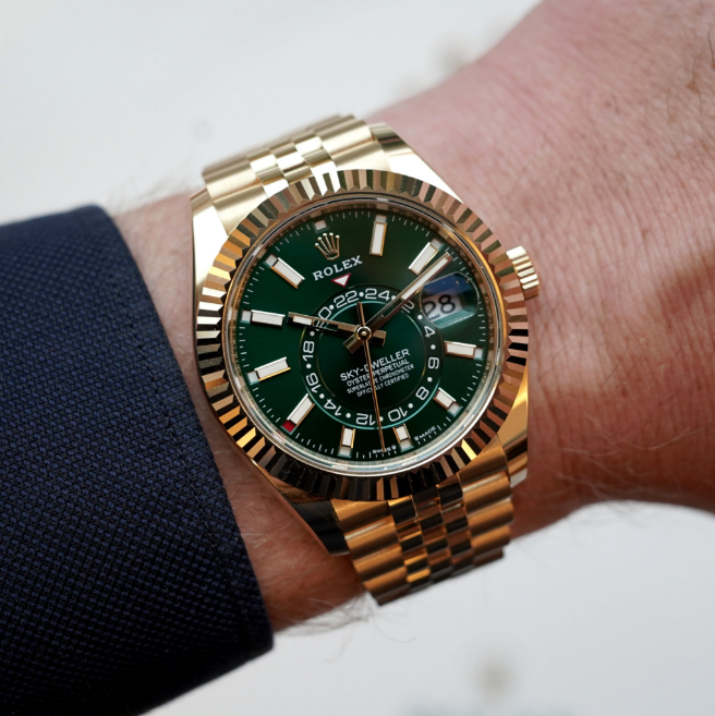 Eine Uhr, die mir erst kürzlich aufgefallen ist, war die letztjährige Sky-Dweller Ref. 336934 aus Edelstahl und Mintgrün. Die Kombination hat mich sofort überzeugt und mich mehr als jede andere Referenz zuvor in die Kollektion gelockt. Die diesjährige Ref. 336938 hat mich jedoch mit ihrem Gelbgoldgehäuse, dem passenden Jubilee-Armband und dem sattgrünen Zifferblatt mit Sonnenschliff einfach umgehauen! Es ist fast schwer in Worte zu fassen, aber ich versuche es trotzdem.