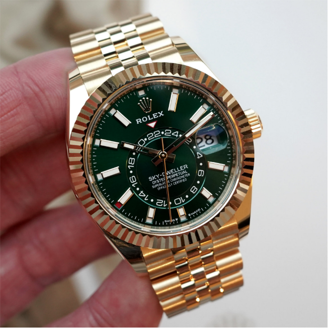 Um Ihnen einen Eindruck von der neuesten Ausgabe der Sky-Dweller zu vermitteln: Sie weist alle Updates des letzten Jahres auf, jedoch in einer neuen Material- und Farbkombination. Sie ist weiterhin 42 mm breit und 13,8 mm hoch und besteht von oben bis unten aus massivem 18-karätigem Gelbgold. Das Zifferblatt mit seinem satten Grünton fällt sofort ins Auge und wechselt bei wechselndem Licht von leuchtendem Grün zu fast Schwarz.